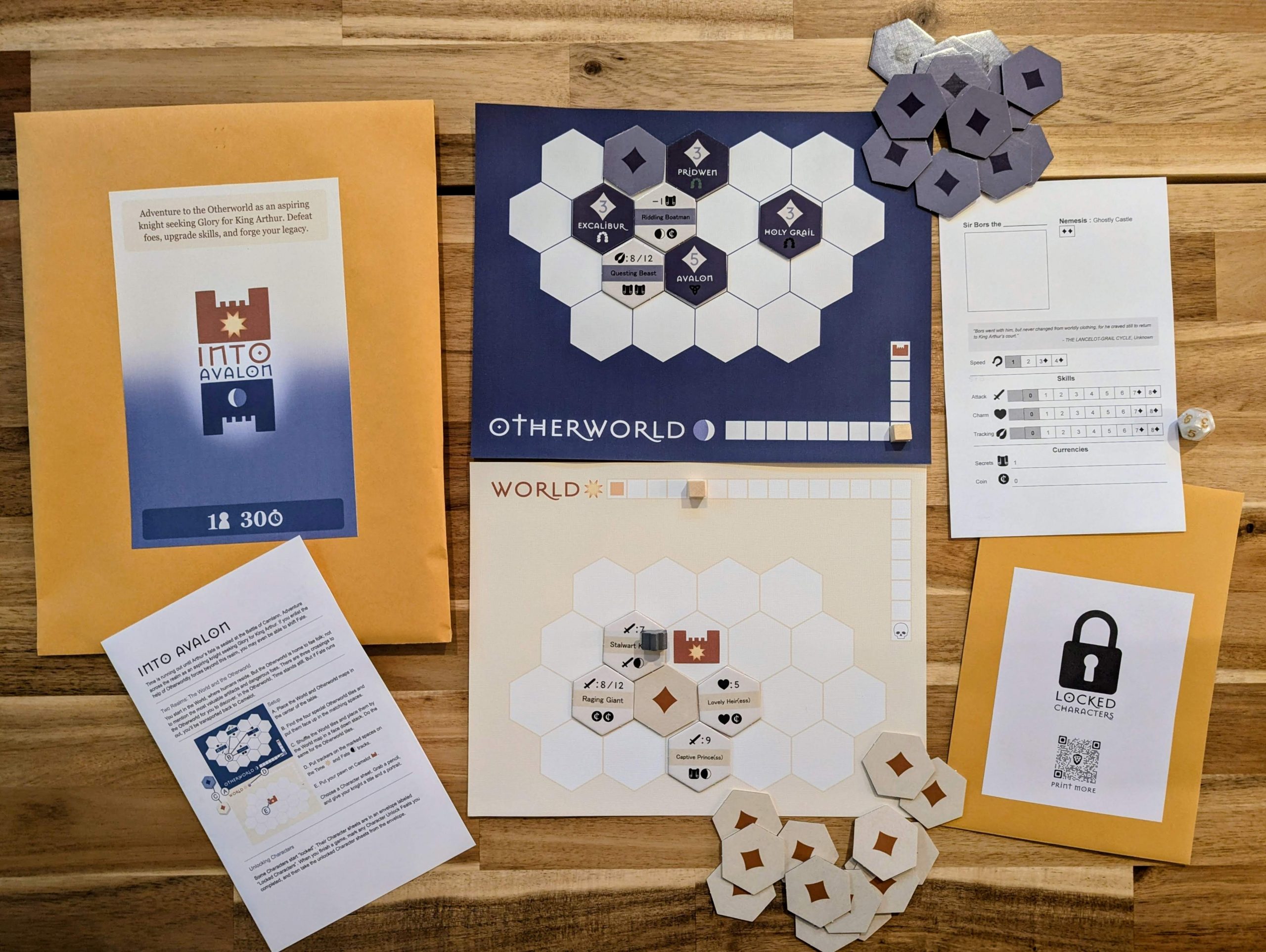In this quick, single player dungeon crawler board game, explore the World map by moving your pawn and revealing hex tiles with challenges and merchants. Complete them to gain skills, currencies, and extra turns. You only have so many turns before the Battle of Camlann, where Arthur is fated to die. Can you save him?